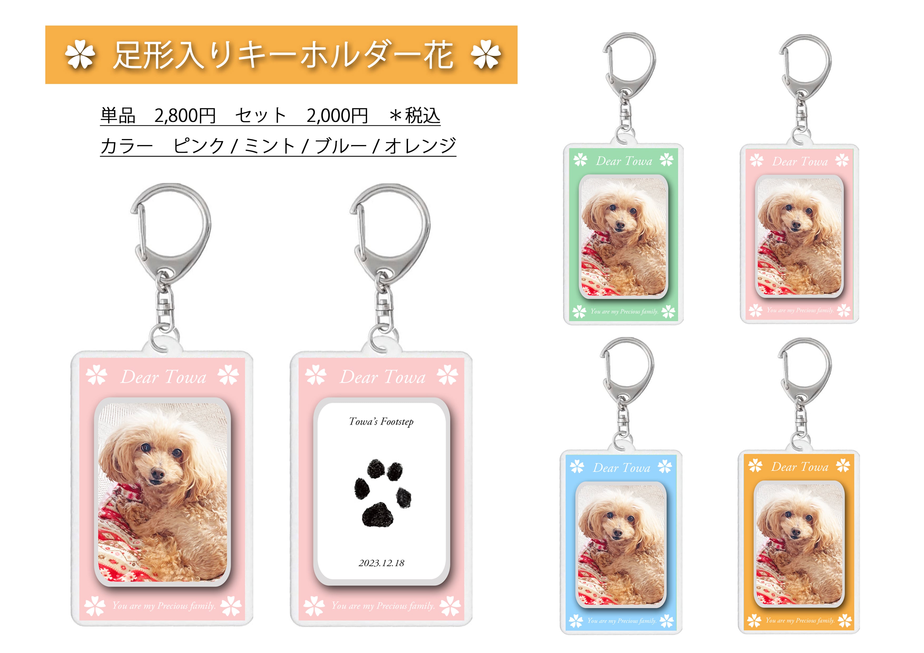 お好きな写真とペットちゃんの足形を入れたキーホルダーをお作りします。